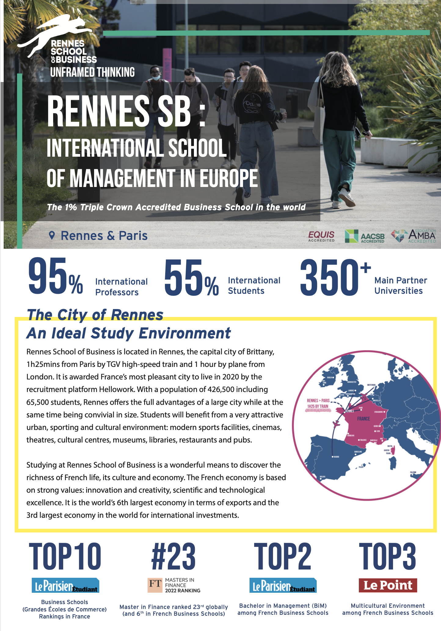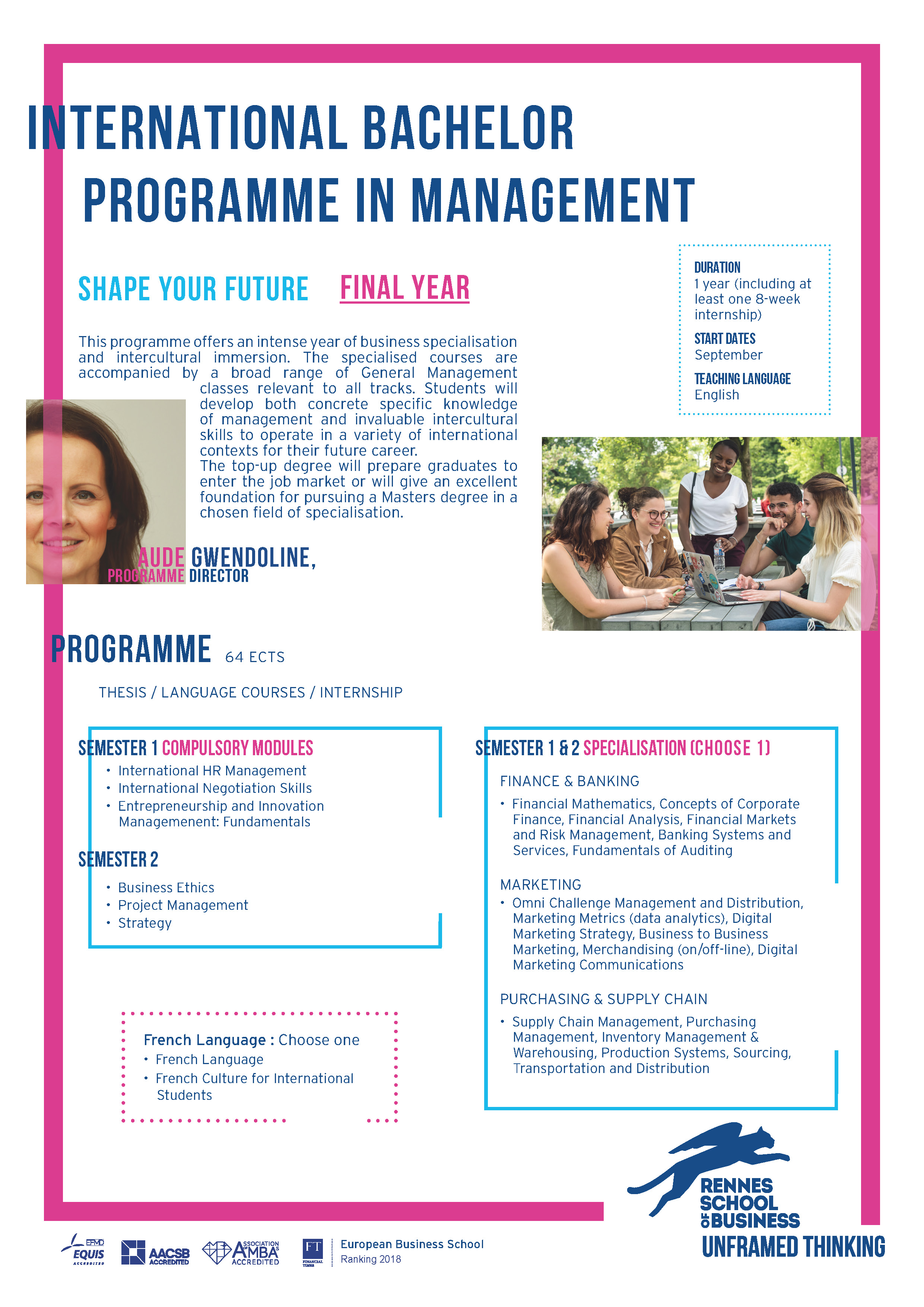 雷恩商學院被譽為全歐洲最國際化的高等商學院之一,全校師資陣容91%皆為外籍教授。國際管理學士學位學程(IBPM)是一個針對高中畢業生所打造的三年制全英語授課學士學位學程。本學程強調國際視野的開拓與國際移動能力的培養,前二學年著重於實務課程訓練以及專業技能培養,並期望學生透過實習提前進入職場學以致用,進而強化學生之就業競爭力。學生於畢業前擁有豐富的履歷後,對於在日後職場或攻讀碩士都有極大的優勢!