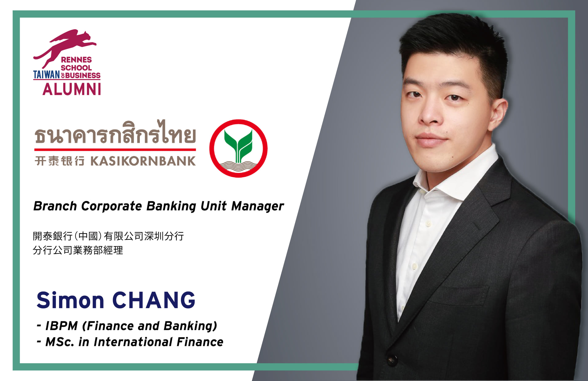 雷恩商學院臺灣校友會在此恭喜校友張詩廷(Simon)(2019 Intl' Finance & 2017 IBPM - Finance and Banking),榮任泰王國開泰銀行( Kasikornbank)中國分公司深圳分行的業務部經理!![]()